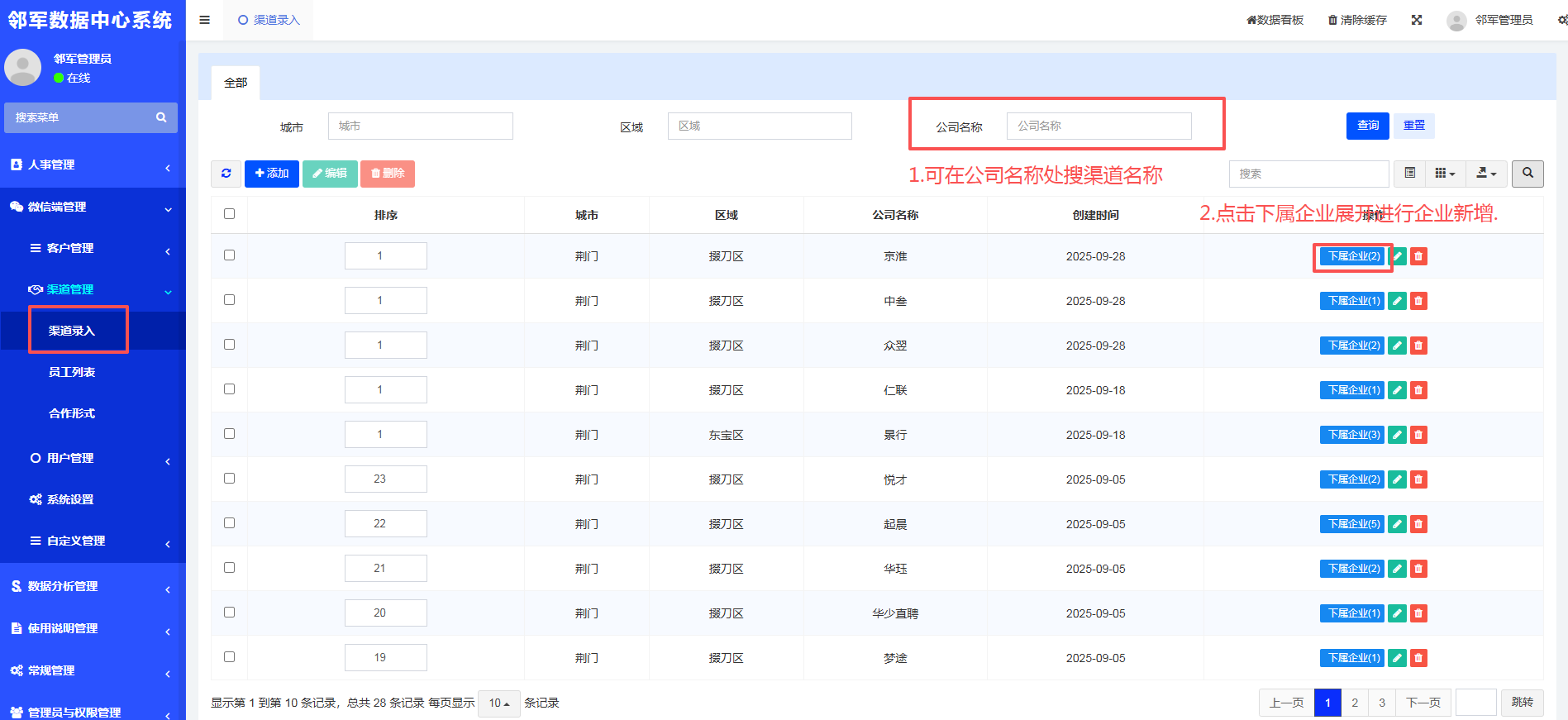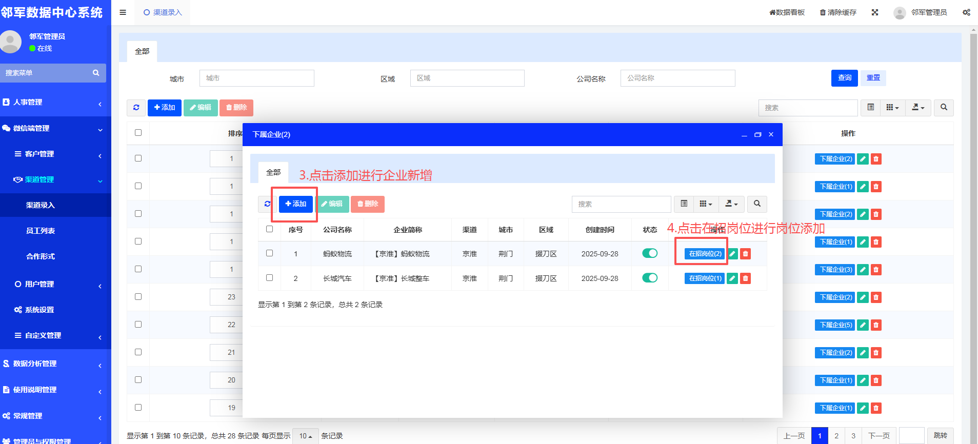 第二,渠道已存在可直接在该渠道最右侧操作栏那里有下属企业,点开后可以新增企业,企业新增后最左侧栏会有下属岗位,再点开进行新增岗位操作;渠道不存在可直接点击页面的添加进行渠道新增,新增后再进行企业及岗位的添加操作。